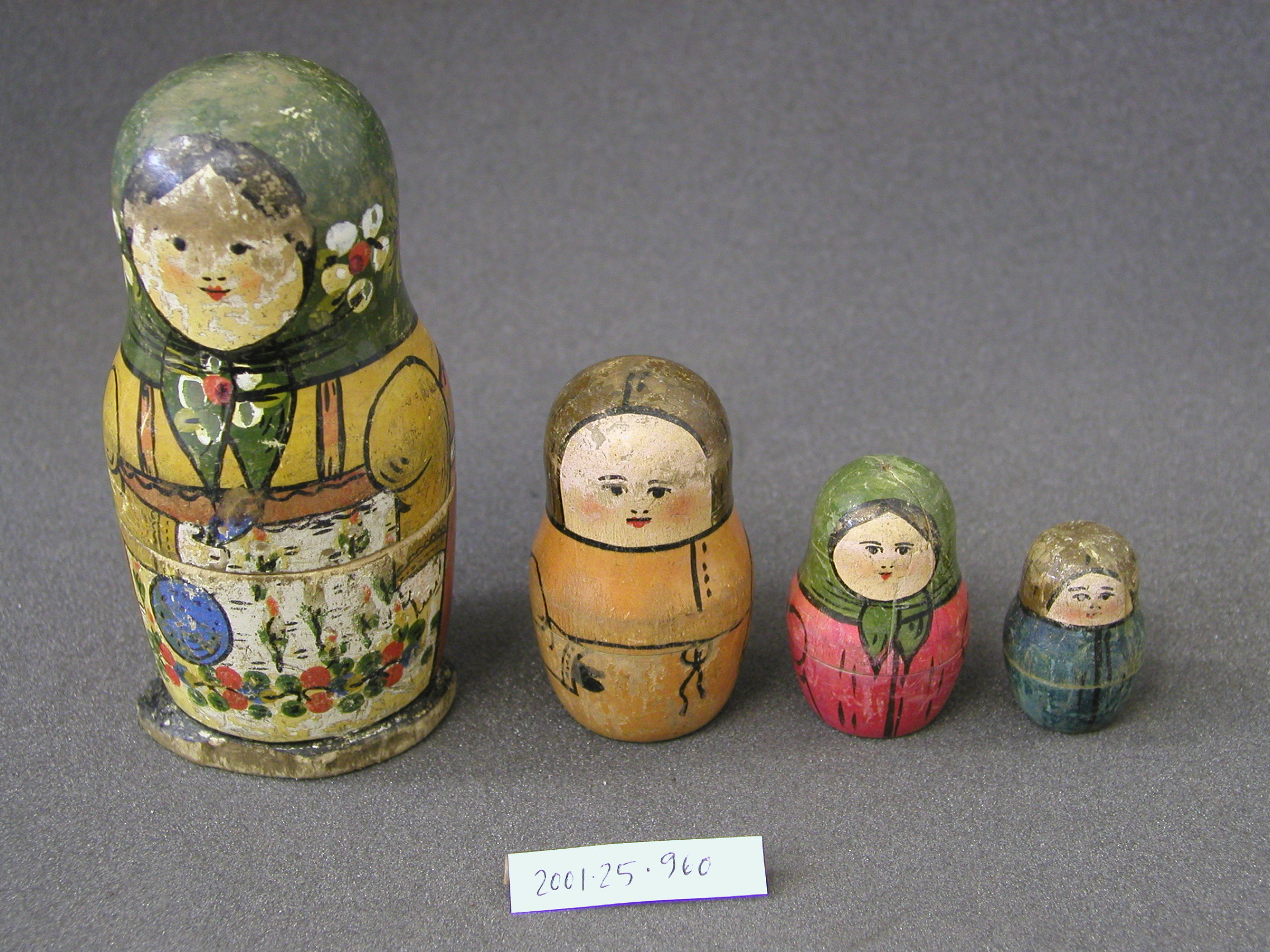 English: Russian nesting dolls - set of 4 dolls (8 parts) collected by Staff Nurse Ethel M Strachan while nursing in Russia during WW1 4 hand painted Russian (stacking) dolls, 1 missimg (smallest) from set, Mother with 3 children all painted in traditional peasant costumes |