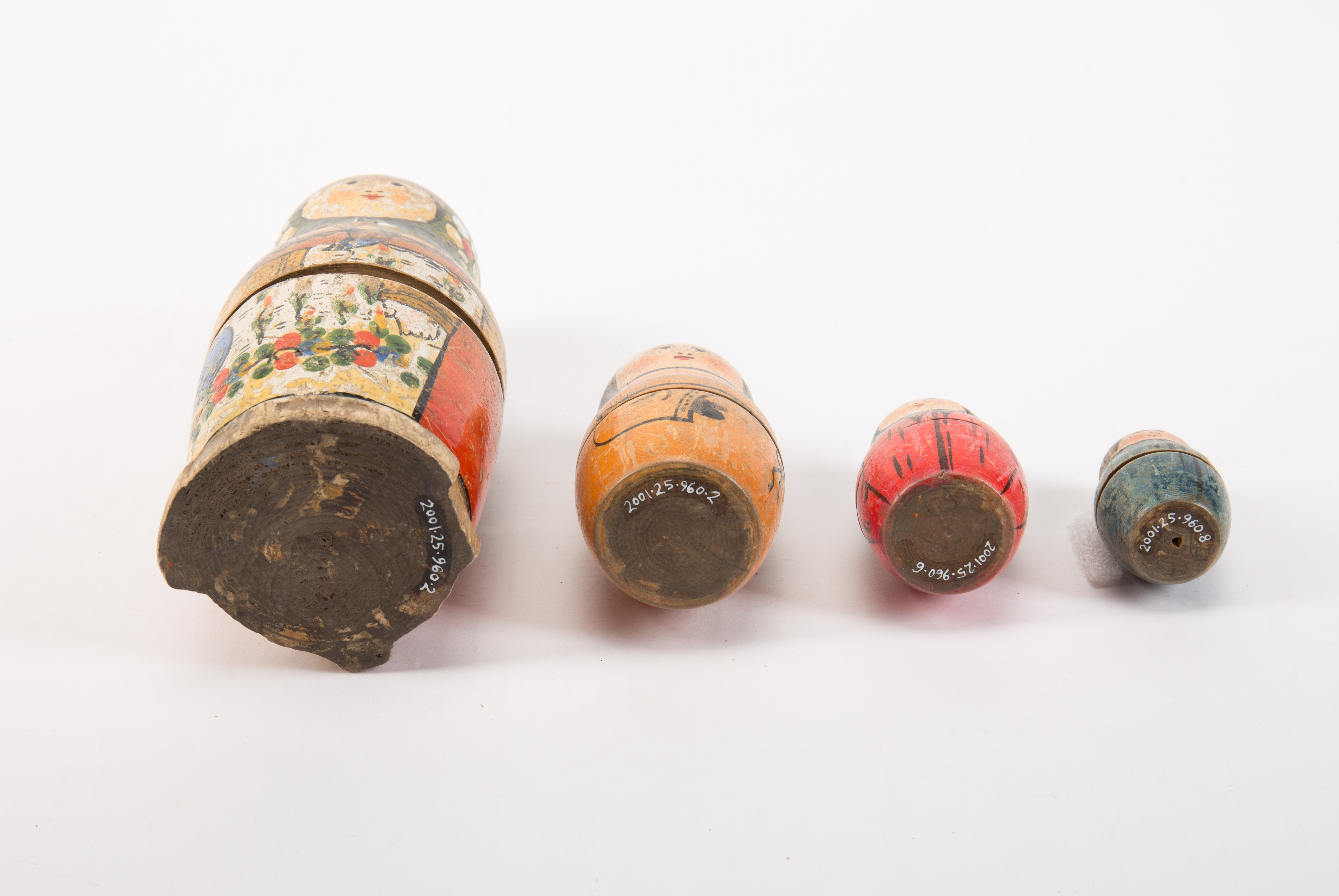 English: Russian nesting dolls - set of 4 dolls (8 parts) collected by Staff Nurse Ethel M Strachan while nursing in Russia during WW1 4 hand painted Russian (stacking) dolls, 1 missimg (smallest) from set, Mother with 3 children all painted in traditional peasant costumes |